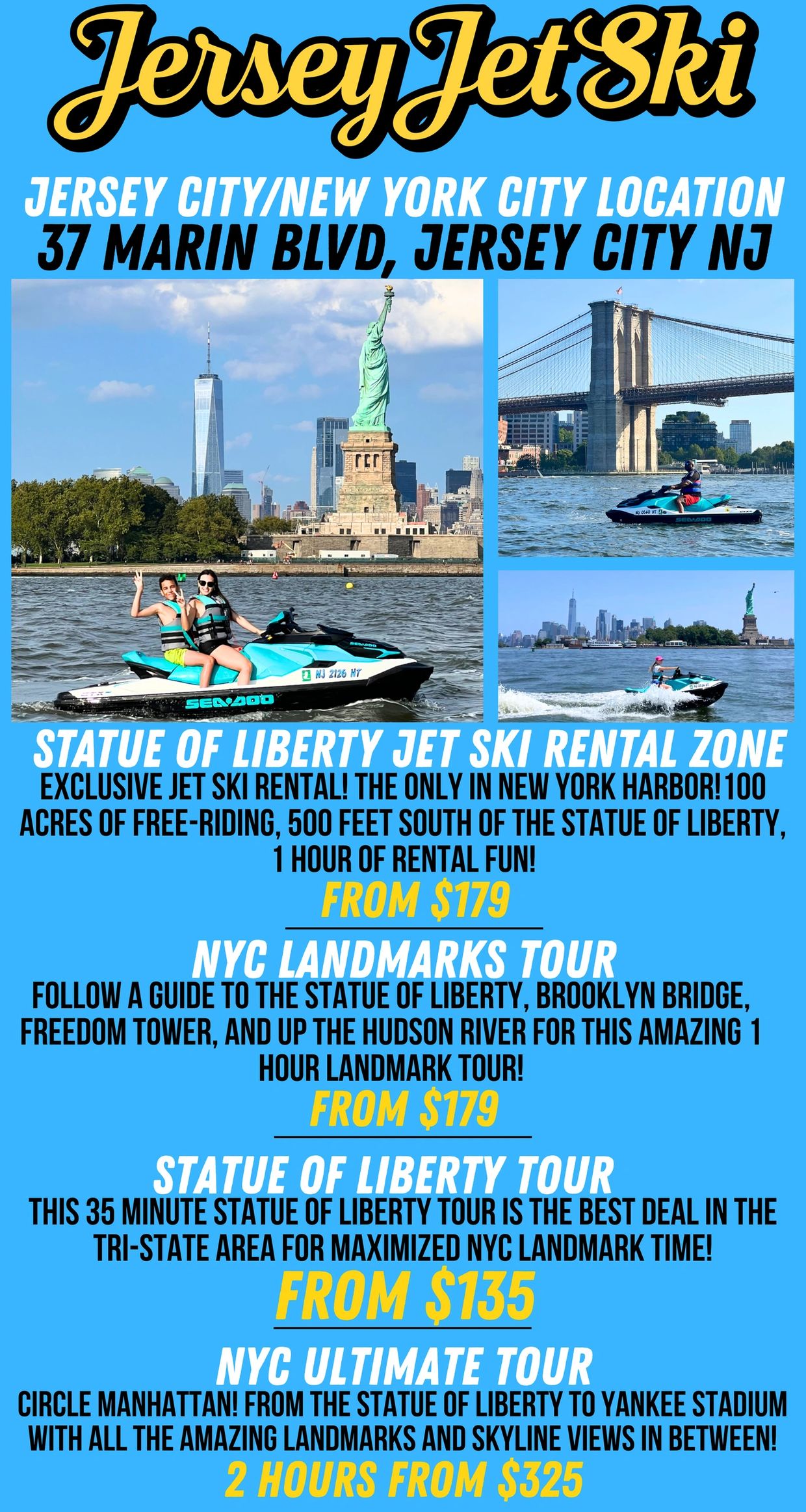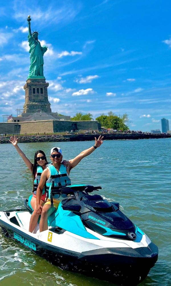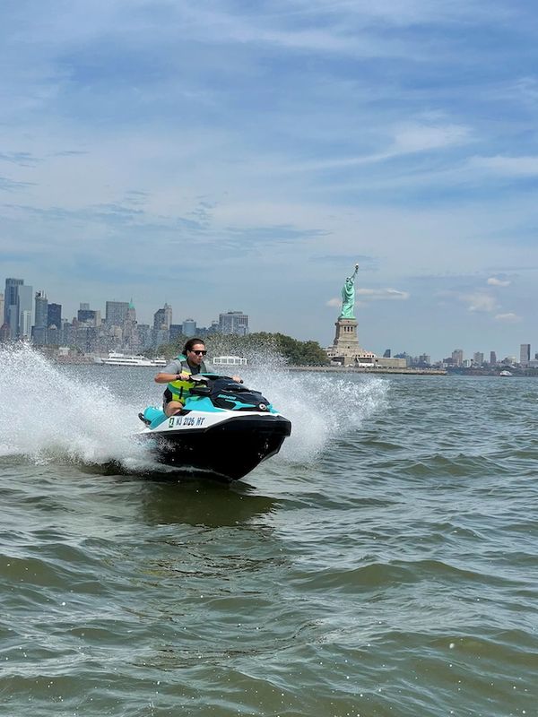 Enjoy a terrific experience jet skiing by the Statue of Liberty and other amazing NYC views great for groups, friends, families, groups, parties, fun!